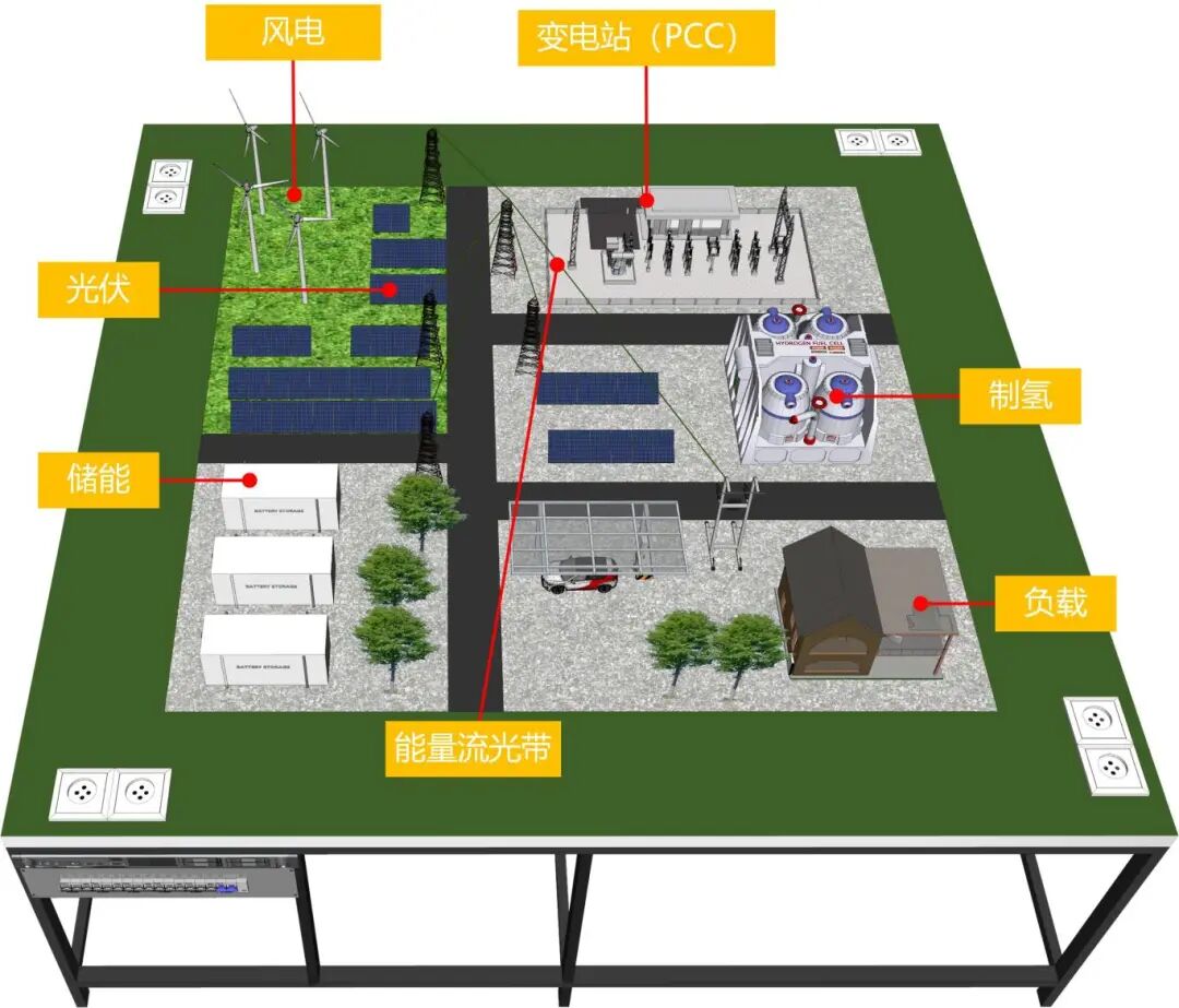 该沙盘模拟了系统中所有设备的实物外观,具体包括以下部分:风电场、光伏电站、集装箱储能电站、制氢站、生活用电负载以及变电站。各分布式能源及负载均以变电站为中心铺设星形电网连接的能量流向LED指示光带,每个独立的子系统控制器均可以根据电流的方向对光带进行控制,增强了系统的演示性和生动性。